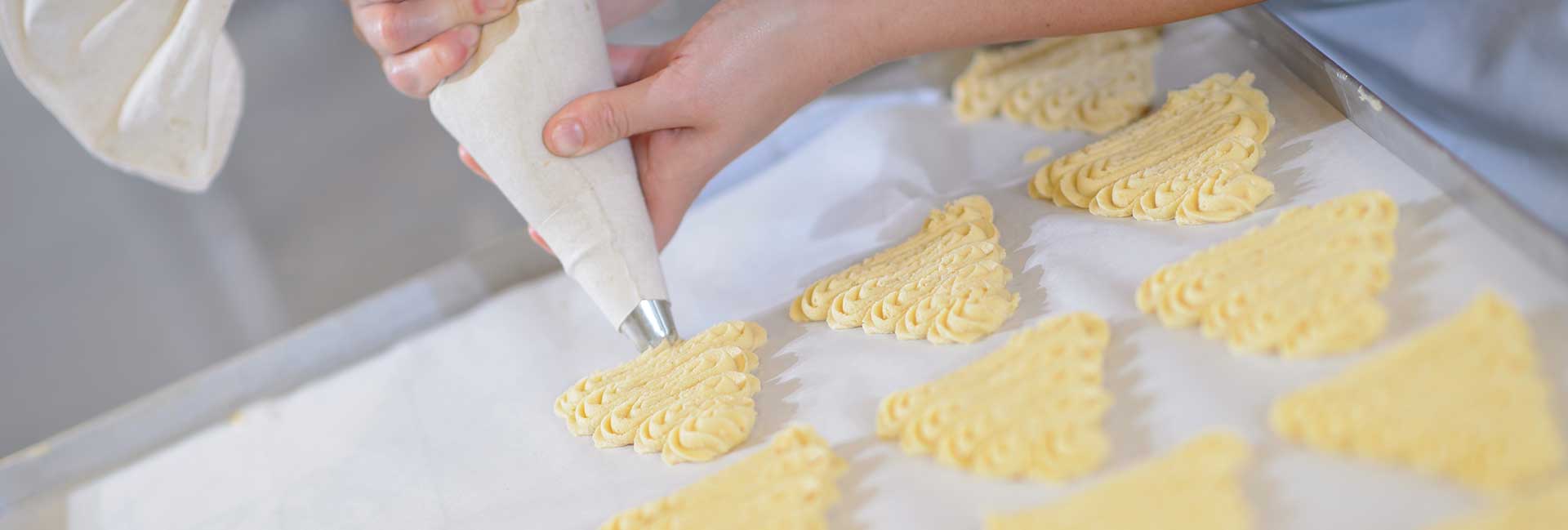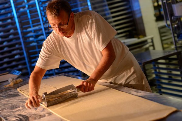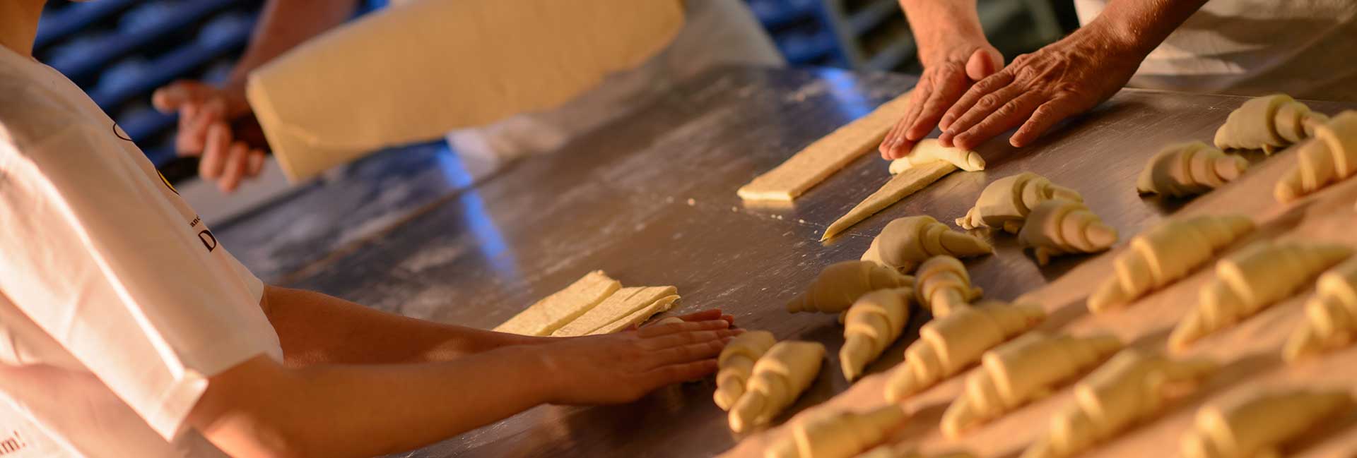 Für diese Art der Hefeteigführung setzen wir den kompletten Teig am Vortag mit einer sehr kleinen Menge Hefe an. Am nächsten Tag schöpfen wir den Teig von Hand, formen Brote oder Baguettes daraus und lassen diese eine weitere Stunde gären, bevor sie in den Ofen kommen. Durch diese Teigführung erhalten unsere MühlenBrote und MühlenBaguettes ihre typisch grobporige, lockere Struktur und plastische Krume. Diese Weißbrot-Spezialitäten bleiben sogar bis zu fünf Tage lang frisch.